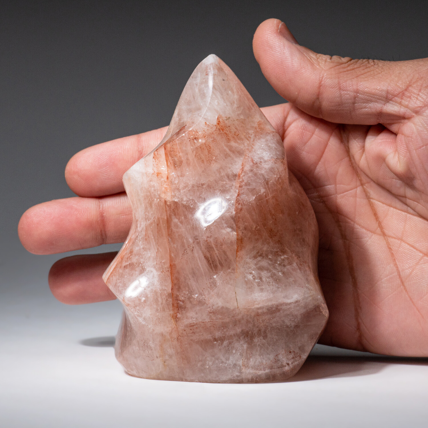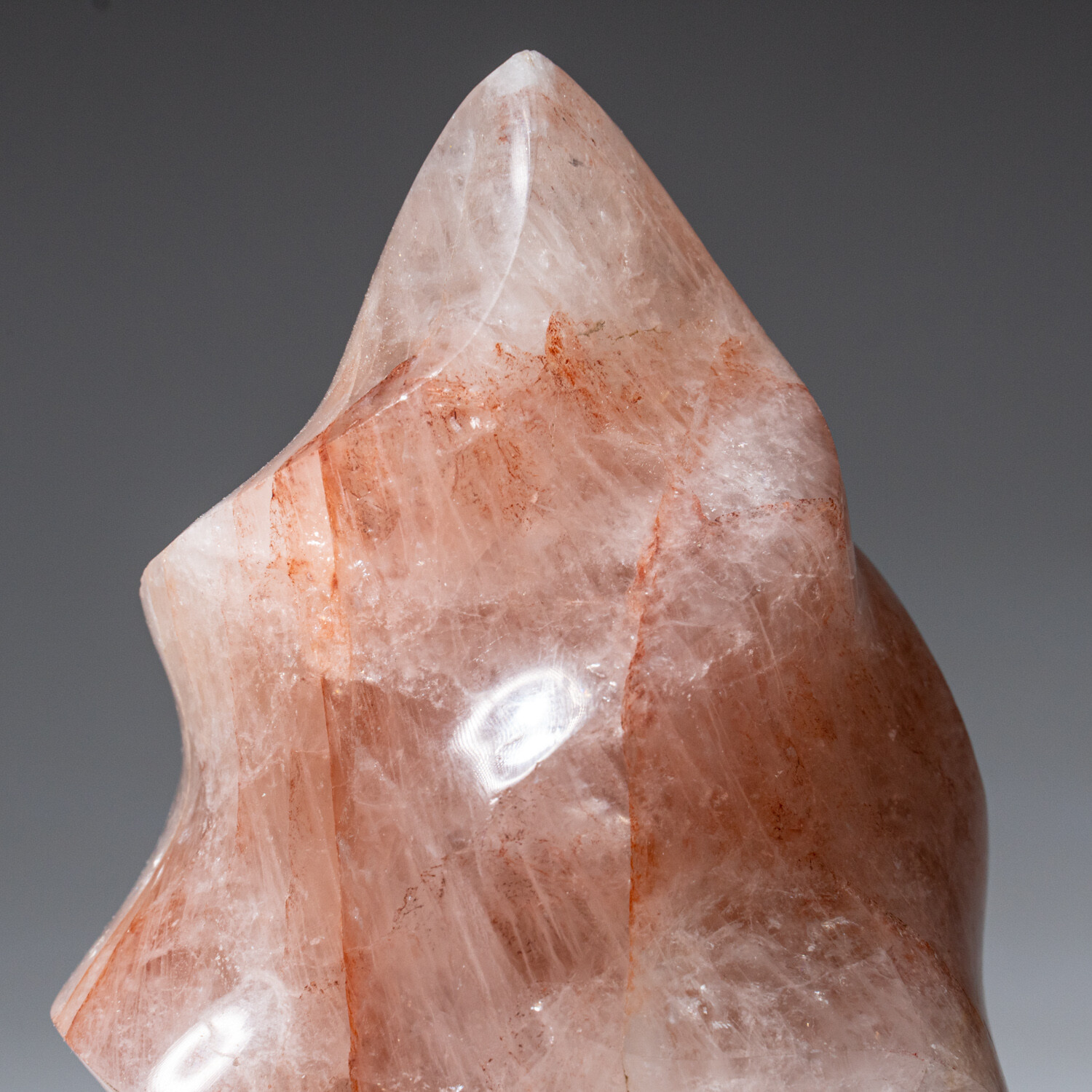 This solid, AAA-quality, polished genuine Strawberry Quartz free-form flame from Madagascar. It has color ranges from light pink, strawberry pink, to raspberry pink. These freeform flames embody the shape of a flame with a tapered-off polished point and preserve the natural essence of its crystal.