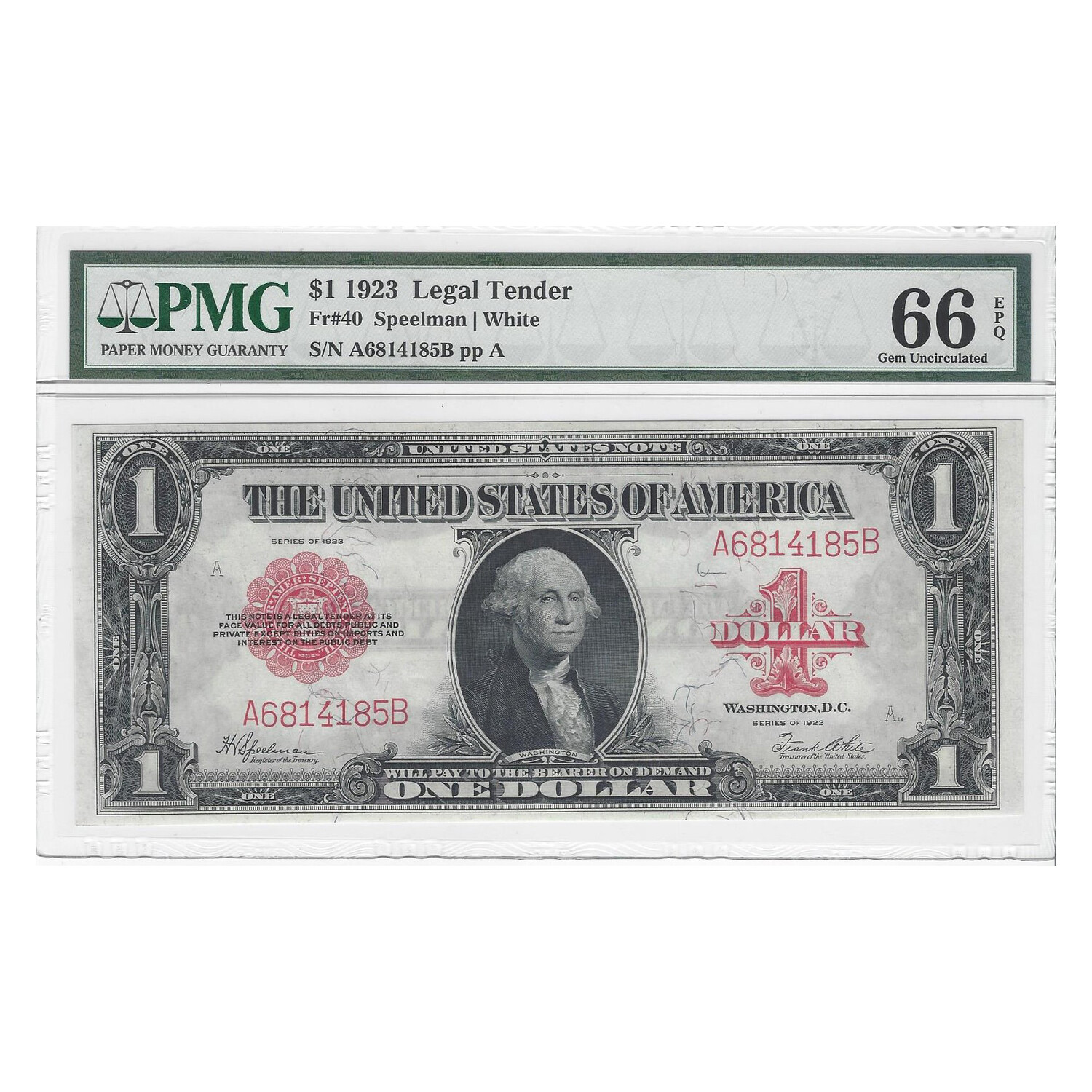 Being offered here is a super high grade $1 Dollar 1923 large size series Legal Tender Note. This series was only printed one time, making this a very rare note. This note has tremendous eye appeal, deep embossing, and perfect centering. The paper is bright with bold inking and sharp edges and corners. This note carries a grade of PMG 66 Gem Uncirculated EPQ (Exceptional Paper Quality). The Gem Uncirculated designation shows that the note looks like it was just printed. This grading is the highest you can get under the PMG guidelines for a 66 grade.