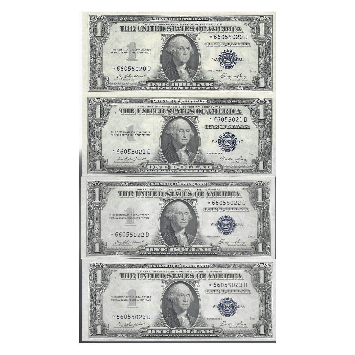 Being offered here is a super rare, original pack of 100 $1 Dollar 1935 “E” Silver Certificates. The great thing here is that the pack contains 4 Star Notes.